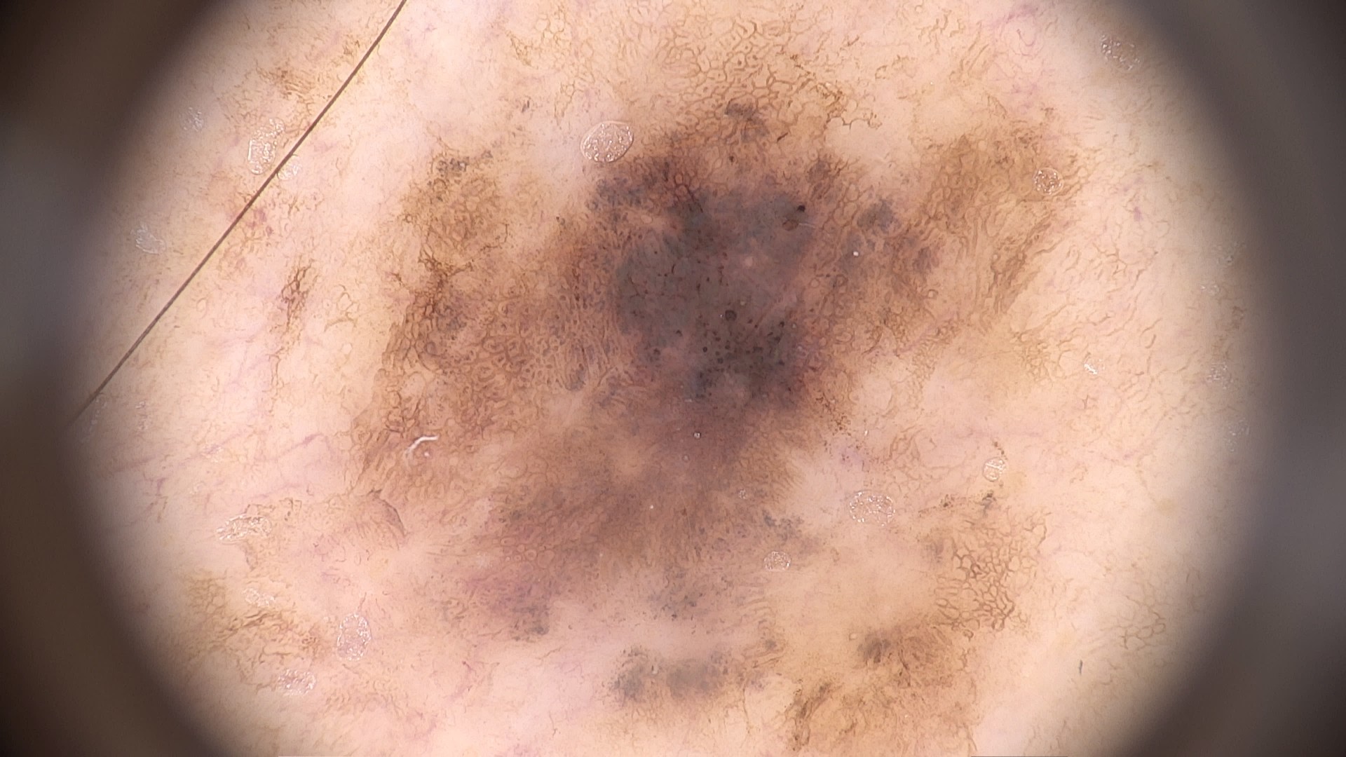 Zunehmend häufig sehen wir Melanome (schwarzer Hautkrebs), die nicht sehr typisch sind. Bei diesem 49-jährigen Patienten jedoch, der sich erstmals bei uns vorstellte, zeigte sich ein Melanom “wie aus dem Lehrbuch”: u.a. zahlreiche verschiedene Farben, Asymmetrie in Bezug auf die Strukturen und Farbe. Mikroskopische Eindringtiefe 0,3 mm. Dieses Melanom gehört zu den sogenannten “dünnen Melanomen”. Die Wahrscheinlichkeit, dass es streut ist äußerst gering.